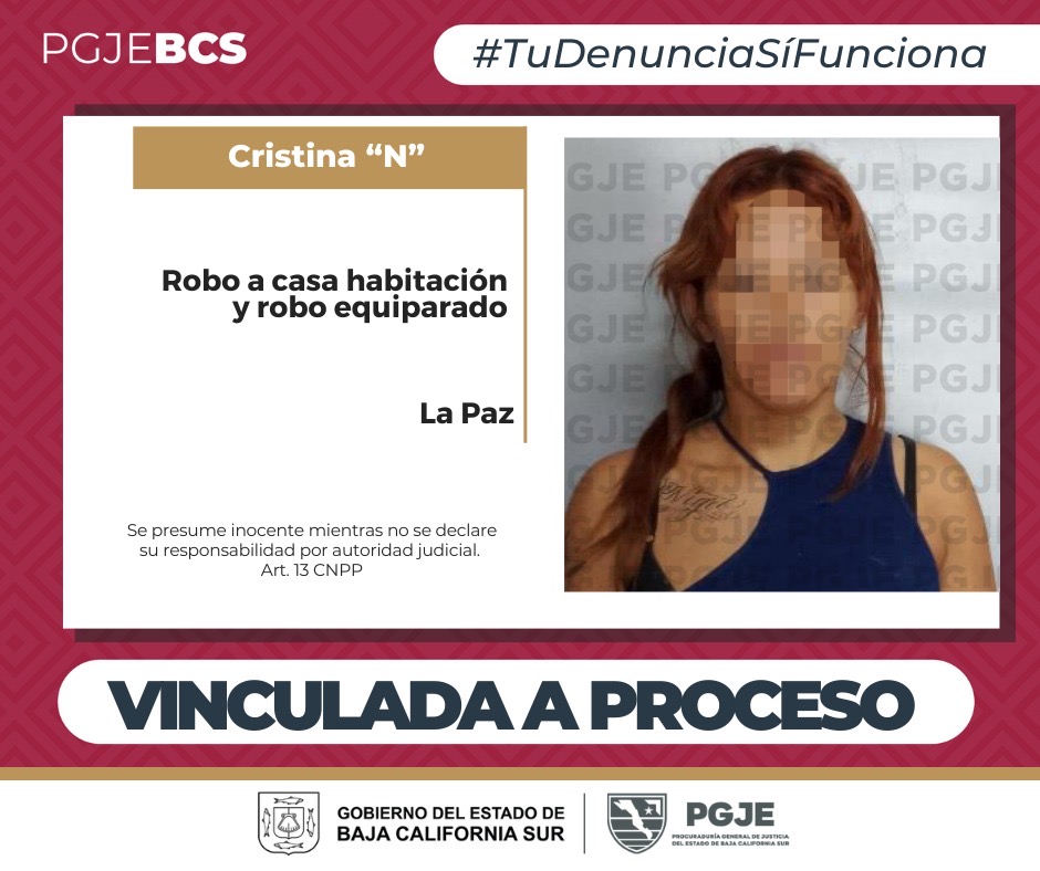 La Procuraduría General de Justicia del Estado (PGJE) de Baja California Sur obtuvo dos vinculaciones a proceso en contra de Cristina “N”, por los delitos de robo equiparado con violencia y robo calificado cometido en casa habitación, por hechos denunciados en la capital del estado.