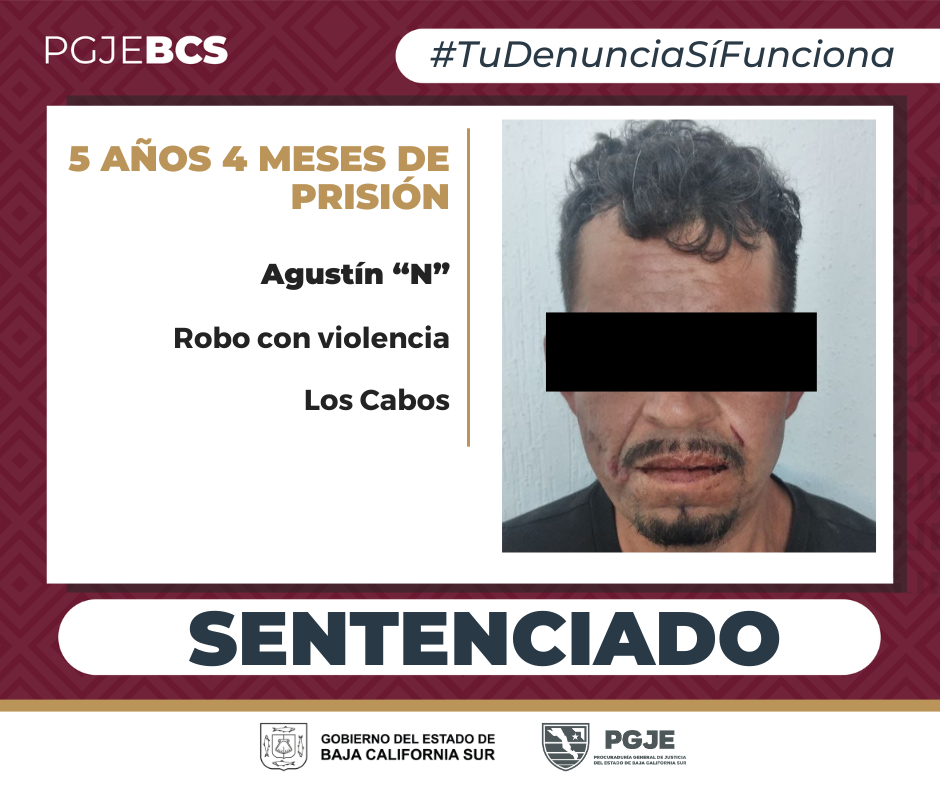 La Procuraduría General de Justicia del Estado (PGJE), de Baja California Sur, obtuvo sentencia condenatoria en contra de una persona del sexo masculino por el delito de robo calificado cometido a vivienda empleando violencia, delito por el cual se le impuso una pena privativa de su libertad de 5 años 4 meses y un día de multa.