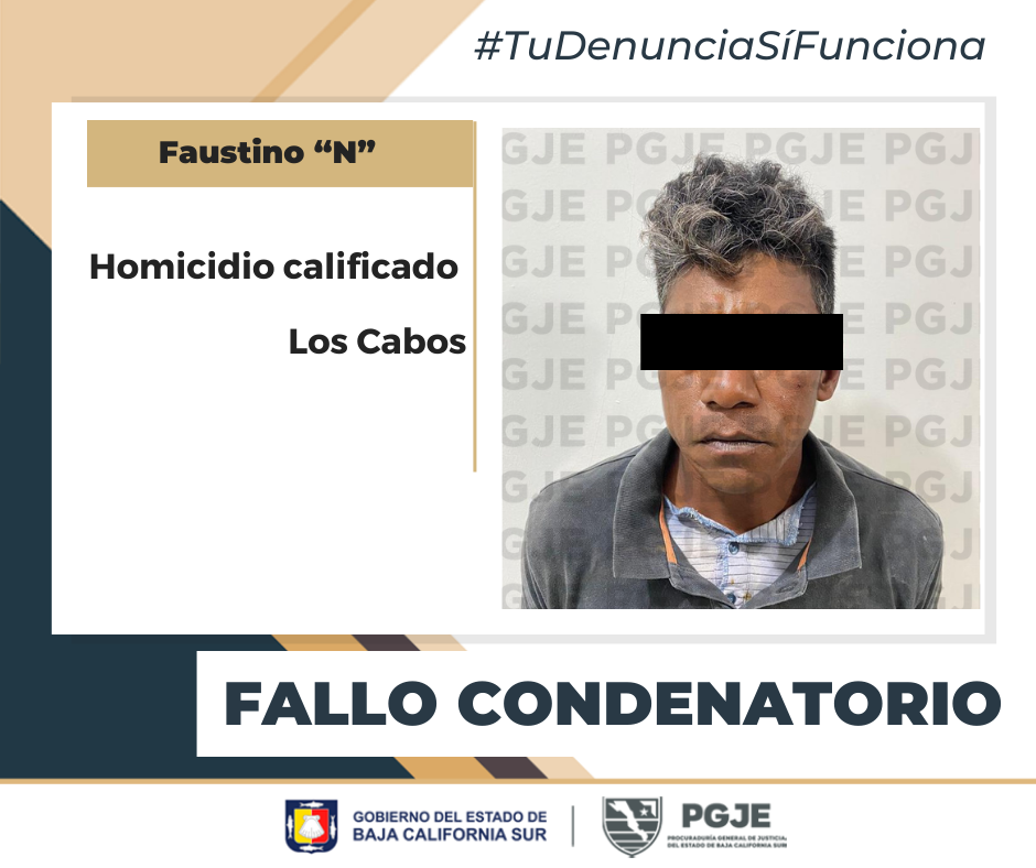 Como resultado de la investigación conducida por la Procuraduría General de Justicia del Estado (PGJE) de Baja California Sur, se obtuvo fallo condenatorio en contra de Faustino N, por el delito de homicidio calificado en agravio de una persona del sexo masculino.