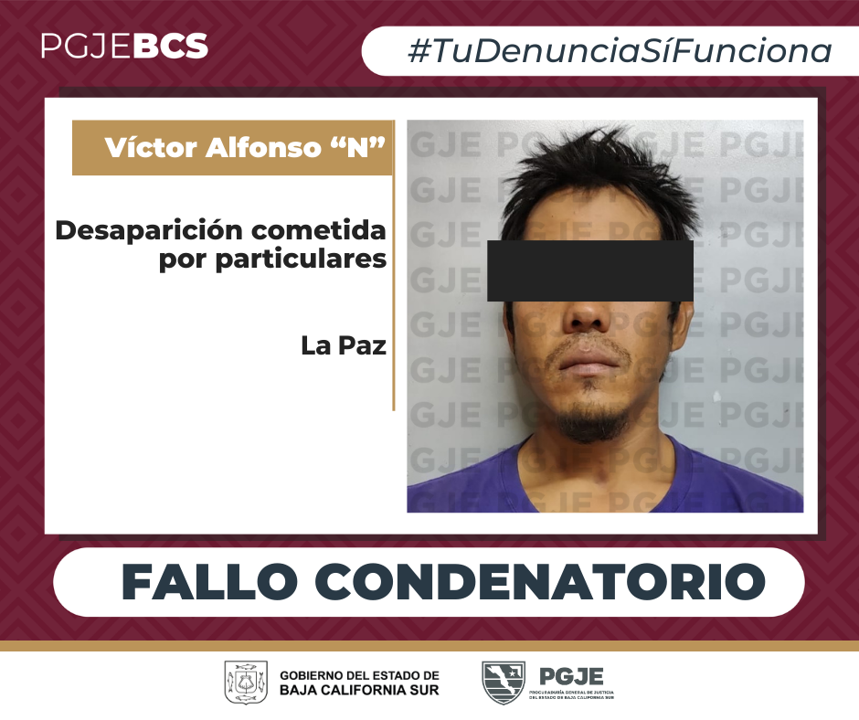 La Procuraduría General de Justicia del Estado (PGJE) de Baja California Sur obtuvo fallo condenatorio, por unanimidad, en contra de Víctor Alfonso “N”, de 33 años de edad, por el delito de desaparición cometida por particulares, tras la conclusión del juicio oral correspondiente.