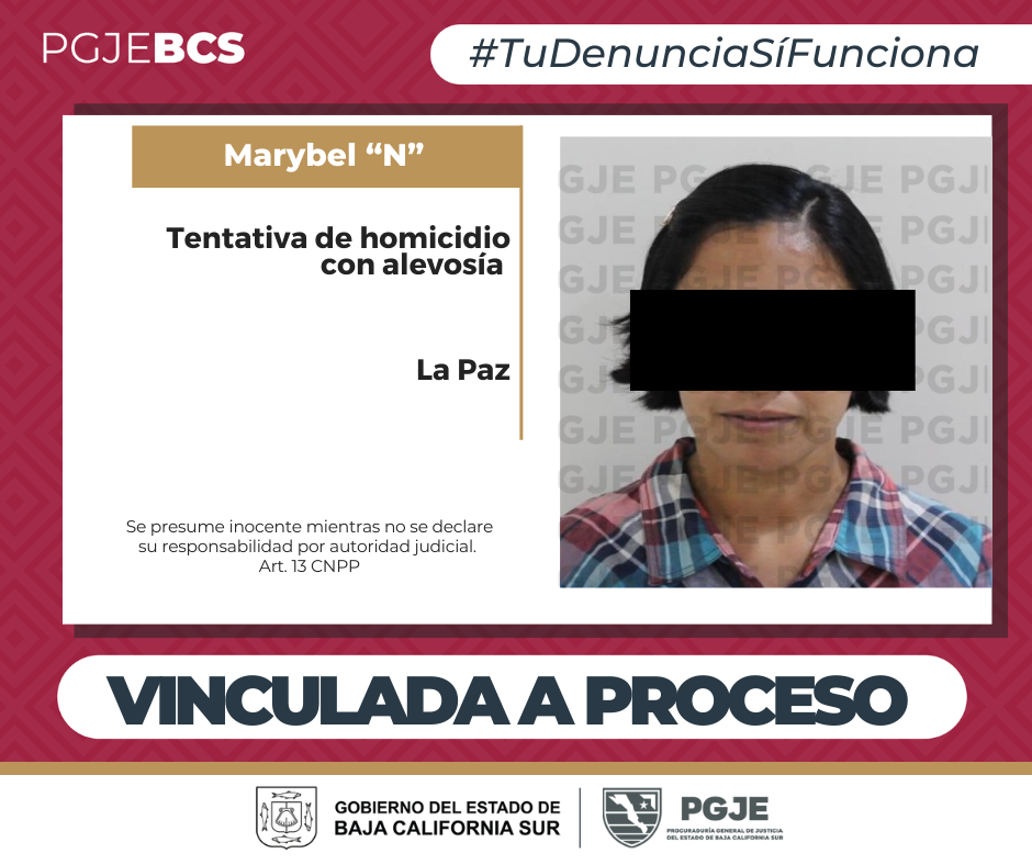 En la continuación de audiencia inicial por citación efectuada el lunes 8 de diciembre del año en curso en el Centro de Justicia Penal de La Paz, Marybel “N”, quedó formalmente vinculada a proceso y permanecerá en prisión el tiempo que dure el proceso, imputada por el delito de homicidio calificado con alevosía por los medios empleados, incendio, en grado de tentativa inacabada en agravio de una persona del sexo masculino.