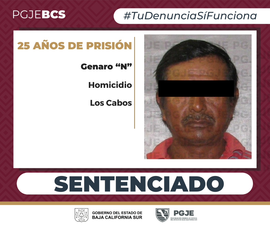 La Procuraduría General de Justicia del Estado (PGJE), logró sentencia condenatoria de 25 años de prisión y el pago de la reparación del daño por 874 mil 722 pesos en contra Genaro N, a quien en juicio oral acreditó su responsabilidad en la comisión del delito de homicidio calificado con ventaja.