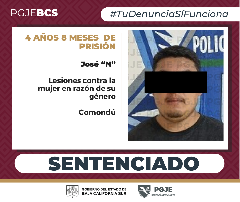 La investigación íntegra y la presentación de pruebas contundentes, la Procuraduría General de Justicia del Estado (PGJE) de Baja California Sur, obtuvo una sentencia condenatoria de 4 años y 8 meses de prisión en contra de José “N”, quien fue hallado culpable del delito de lesiones cometidas contra la mujer en razón de su género.