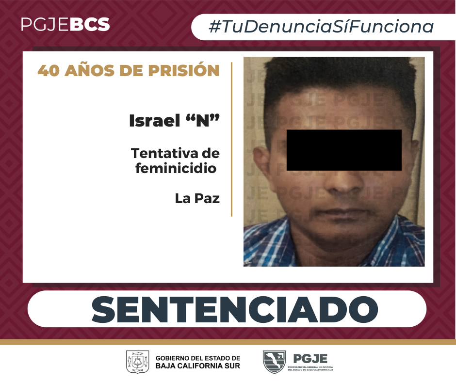 Por el delito de feminicidio agravado en grado de tentativa acabada, Israel “N” fue sentenciado a 40 años de prisión y al pago genérico de la reparación del daño, tras acreditarse su responsabilidad en los hechos registrados la madrugada del 14 de agosto en La Paz.