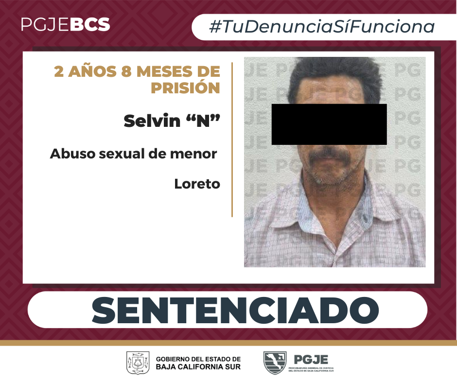 La Procuraduría General de Justicia del Estado (PGJE) de Baja California Sur, obtuvo sentencia condenatoria en contra de Selvín “N”, por el delito de abuso sexual cometido en agravio de una persona menor de edad.
