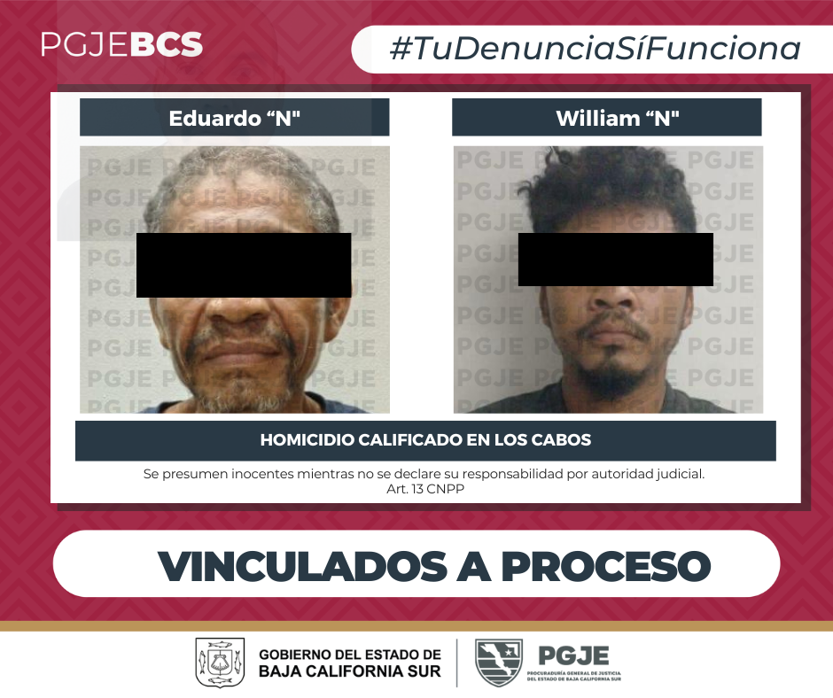 La Procuraduría General de Justicia del Estado (PGJE) de Baja California Sur, obtuvo auto de vinculación a proceso en contra de William “N”, de 29 años, originario de Guerrero, y Eduardo “N”, de 54 años, originario de Oaxaca, por su probable responsabilidad en el delito de homicidio calificado en agravio de dos personas.