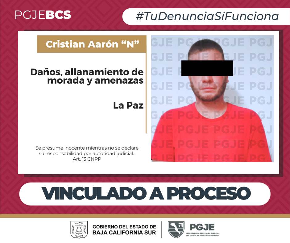 La Procuraduría General de Justicia del Estado (PGJE) de Baja California Sur, logró la vinculación a proceso de Cristian Aarón “N” por su probable responsabilidad en los delitos de daños, allanamiento de morada y amenazas.