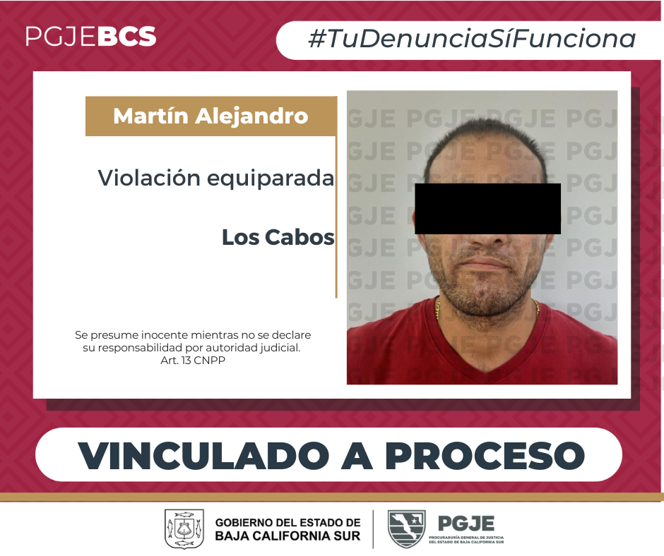 La Procuraduría General de Justicia del Estado (PGJE) de Baja California Sur, obtuvo en la audiencia inicial por ejecución de orden de aprehensión, la vinculación a proceso de Martín Alejandro “N” por dos cargos de violación equiparada agravada en perjuicio de una adolescente.
