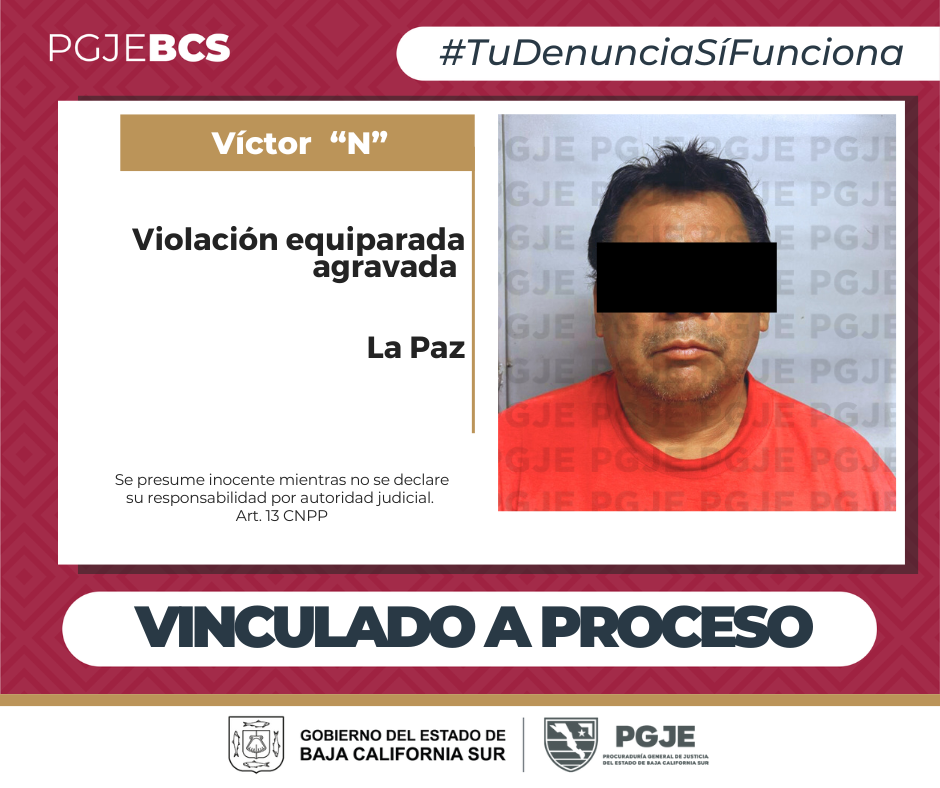 Como resultado de las acciones de investigación realizadas por la Procuraduría General de Justicia del Estado (PGJE) de Baja California Sur, una Jueza de Control vinculó a proceso a Víctor Hugo “N” por el delito de violación agravada ocurrido en un domicilio de la colonia Arboledas en la capital del estado.