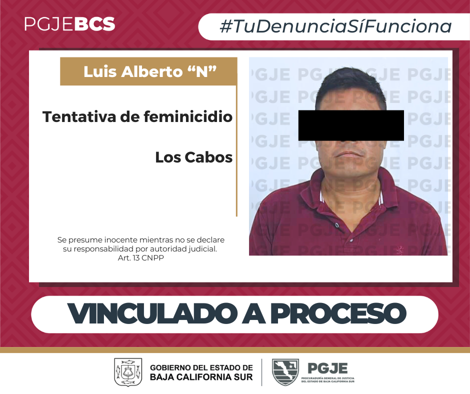Gracias al trabajo de investigación, la recolección de indicios y las pruebas periciales presentadas por el agente del Ministerio Público de la Unidad Especializada para la Investigación y Persecución de los Delitos de Homicidios Dolosos, la Procuraduría General de Justicia del Estado (PGJE) de Baja California Sur obtuvo la vinculación a proceso de Luis Alberto “N”, por su probable responsabilidad en el delito de feminicidio en grado de tentativa inacabada, en agravio de su pareja.