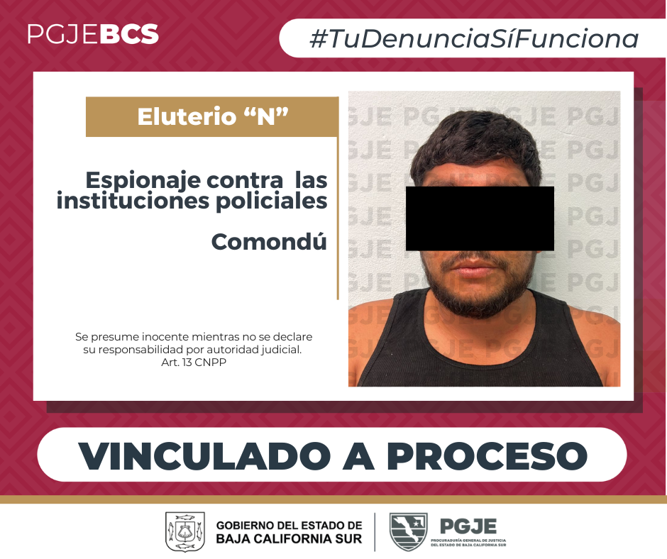 La Procuraduría General de Justicia del Estado (PGJE) de Baja California Sur obtuvo vinculación a proceso de Eluterio “N”, por el delito de espionaje contra las instituciones policiales, de seguridad pública y procuración de justicia (conocido popularmente como halconeo).