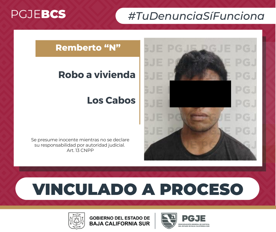 La Procuraduría General de Justicia del Estado (PGJE) de Baja California Sur logró la vinculación a proceso y la imposición de prisión preventiva oficiosa en contra de Remberto “N”, de 27 años, por su probable responsabilidad en el delito de robo calificado cometido en vivienda.