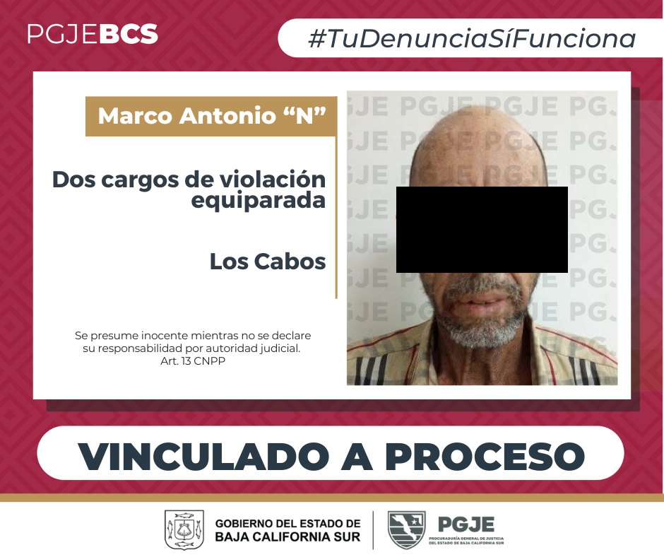 La Procuraduría General de Justicia del Estado (PGJE) de Baja California Sur, como parte de su compromiso con la protección de las víctimas y el combate a los delitos que atentan contra la integridad de las personas, obtuvo la vinculación a proceso y la imposición de prisión preventiva justificada en contra de Marco Antonio “N”, por su probable responsabilidad en dos cargos de violación equiparada.