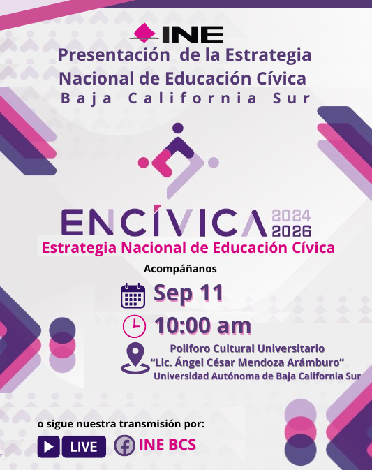 Para dar a conocer el contenido de la Estrategia Nacional de Educación Cívica 2024-2026 (ENCÍVICA), la Junta Local Ejecutiva del INE en Baja California Sur, organiza un evento de presentación, a desarrollarse en las instalaciones del Poliforo Cultural Universitario “Lic. Ángel César Mendoza Arámburo” de la Universidad Autónoma de Baja California Sur, ubicada en Boulevard Forjadores S/N entre Av. Universidad y Calle Félix Agramont Cota, Col. Universitario, La Paz, Baja California Sur, el 11 de septiembre de 2024 a las 10:00 horas.