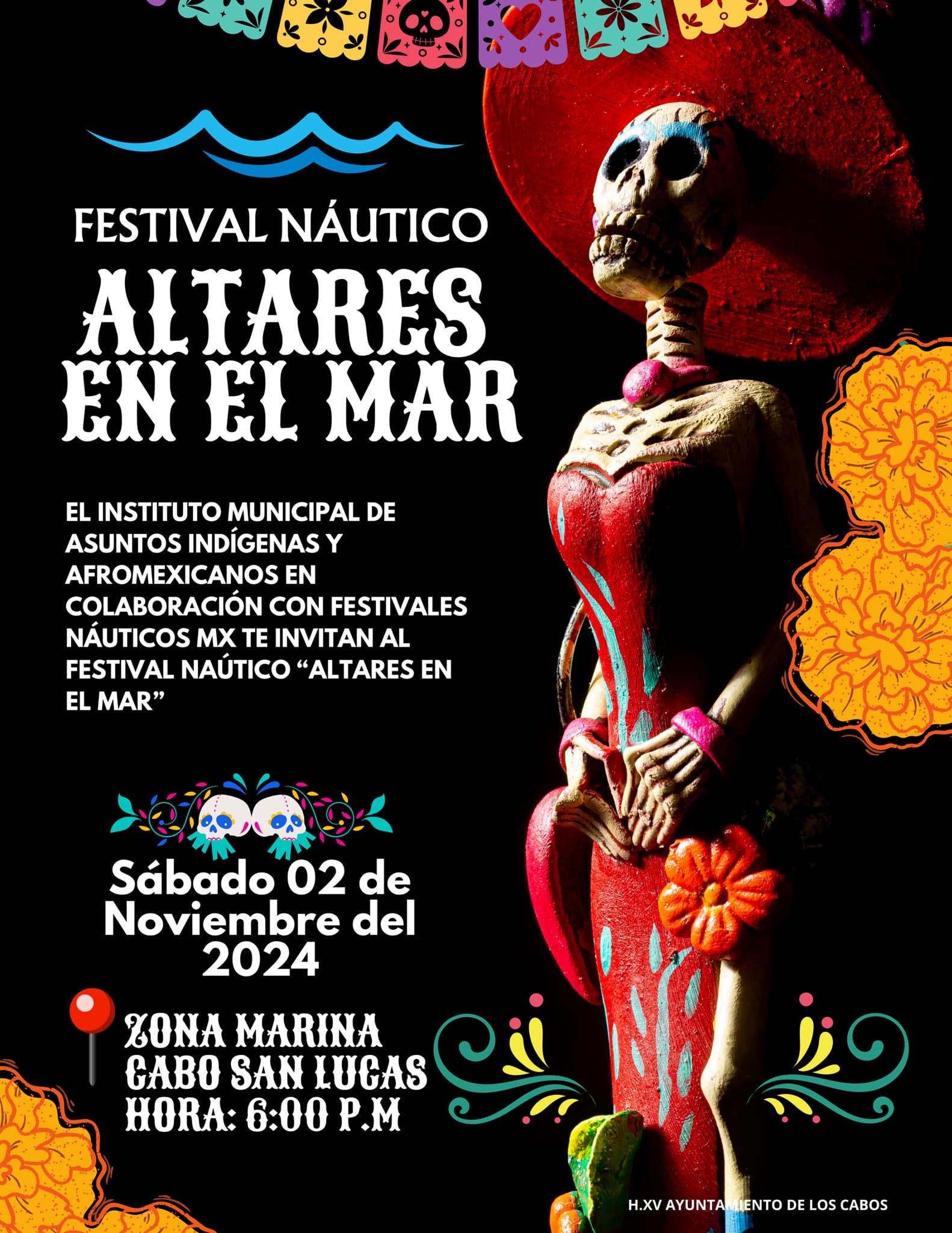 Los Cabos, Baja California Sur.- En el marco de la celebración del Día de Muertos, el XV Ayuntamiento de Los Cabos, a través del Instituto Municipal de Asuntos Indígenas y Afromexicanos (IMAIA) del cual es titular, Leonardo Jiménez Castrejón, participará con un programa artístico – cultural en la 4ª edición de “Altares en el Mar” 2024, Desfile Náutico Día de Muertos, en la zona de la Marina, en Cabo San Lucas, 6:00 de la tarde.