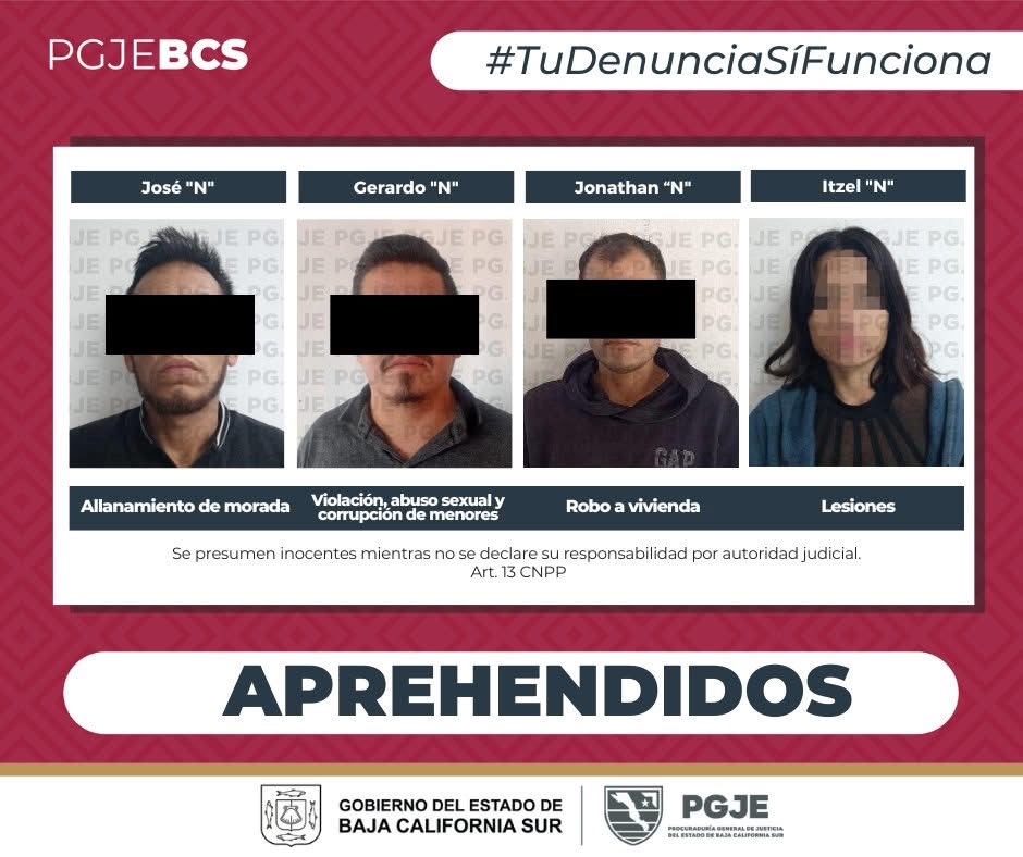 La Procuraduría General de Justicia del Estado (PGJE), realizó operativos mediante los cuales, aprehendió a 3 personas del sexo masculino y una del sexo femenino, en seguimiento a investigaciones por denuncias de actividades ilícitas en los municipios de Comondú, La Paz y Los Cabos.
