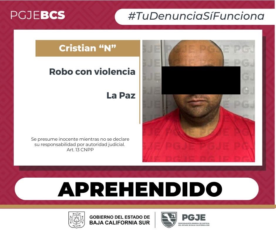 Como resultado de la denuncia interpuesta por la parte afectada y de las labores de investigación realizadas, agentes de investigación adscritos a la Unidad de Mandamientos Judiciales y Presentaciones de la Procuraduría General de Justicia del Estado (PGJE) de Baja California Sur, lograron localizar y detener a una persona del sexo masculino por su probable responsabilidad en el delito de robo calificado.