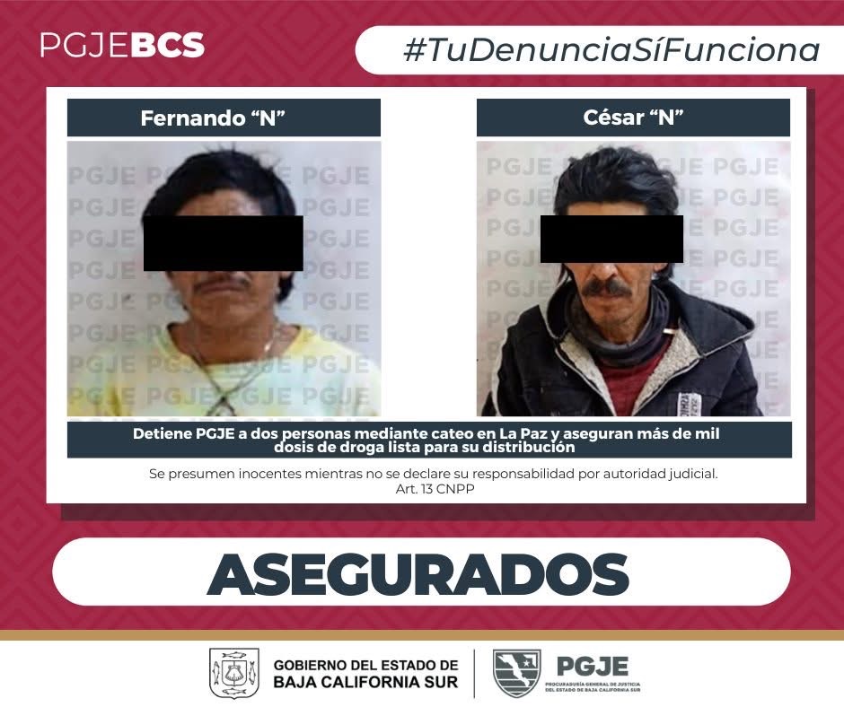 Durante la diligencia fueron detenidos César Martín “N” de 50 años, originario de Los Cabos, y Fernando “N” de 39 años, originario de Chiapas.