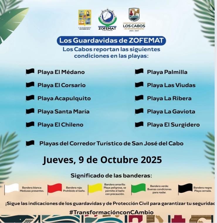 Los Cabos, Baja California Sur.- La Coordinación Municipal de la Zona Federal Marítimo Terrestre (Zofemat) de Los Cabos informa que, debido a los efectos y afectaciones ocasionadas por el paso del huracán “Priscilla”, las playas del municipio continúan cerradas al público y mantienen bandera negra, lo que indica prohibición total de ingreso al mar y suspensión de actividades acuáticas y recreativas, hasta nuevo aviso.