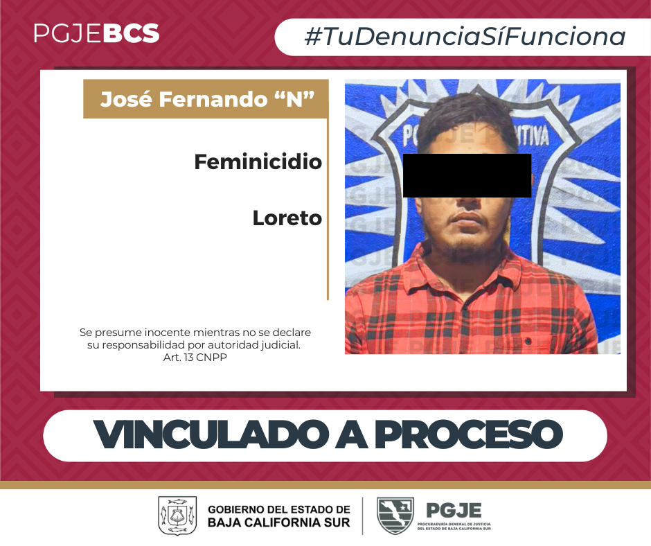 Durante la audiencia de inicial por orden de aprehensión efectuada el viernes 6 de noviembre del año en curso en el Centro de Justicia Penal de Loreto, la Procuraduría General de Justicia del Estado (PGJE), obtuvo vinculación a proceso y prisión preventiva en contra de José Fernando “N”, imputado de privar de la vida a una mujer en Loreto.