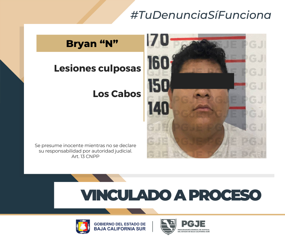 El martes 9 de abril del año en curso en el Centro de Justicia Penal de Cabo San Lucas, se celebró la audiencia inicial para control de detención, en la que el agente del Ministerio Público de la Unidad Especializada en Atención a Personas Detenidas, aportó datos de prueba que permitieron al Juez de Control dictar Auto de Vinculación a Proceso en contra de una persona del sexo masculino, a quien se relacionó como imputado en una carpeta de investigación, por un hecho que la Ley contempla como delito de lesiones culposas.