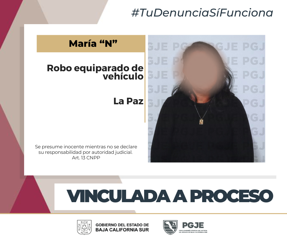 La noche del sábado 16 de noviembre, María N fue sorprendida en posesión de un vehículo marca Honda, sin placas, en el estacionamiento de una tienda departamental que se ubica en las calles 5 de Mayo y Josefa Ortiz de Domínguez, en la colonia Centro de La Paz, el cual tenía reporte de robo.