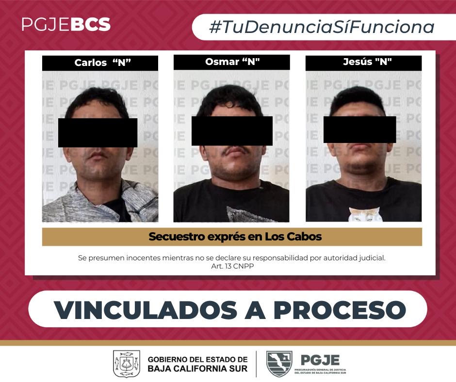 El agente del Ministerio Público Unidad Especializada en Investigación de Delito de Secuestro, de la Procuraduría General de Justicia del Estado (PGJE), obtuvo la vinculación a proceso de Osmar Arturo “N”, Jesús Eduardo “N” y Carlos “N”, imputados por el delito de secuestro exprés, que probablemente cometieron el pasado sábado 3 de enero, del 2026 en la ciudad de Cabo San Lucas.