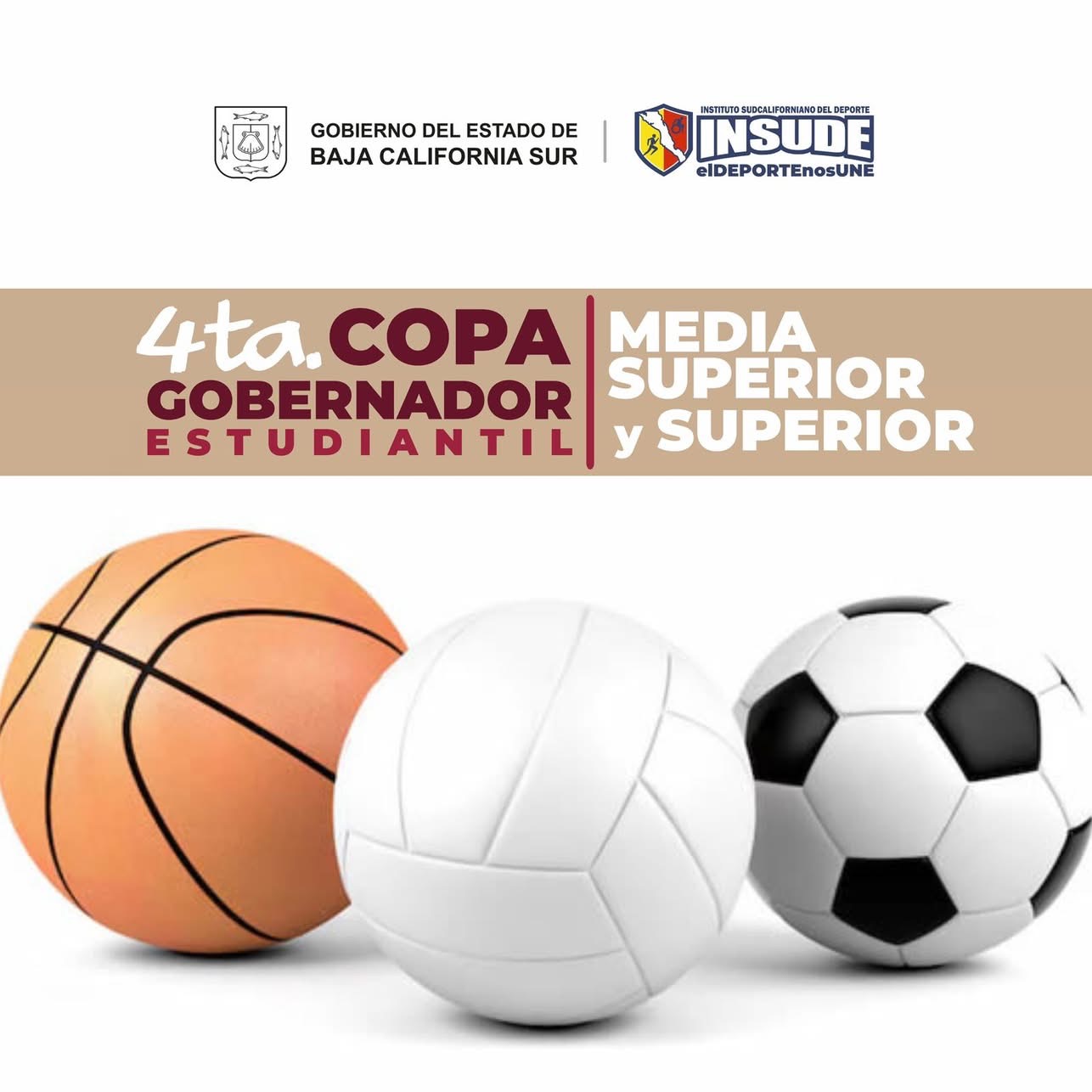 Del 4 de octubre al 11 de diciembre, el Instituto Sudcaliforniano del Deporte llevará a cabo la IV edición de la Copa Gobernador en la que podrán participar estudiantes de nivel media superior y superior, en los deportes de voleibol, básquetbol, futbol y futbol 7, informó la subdirectora de cultura física en el Insude, Astrid Cañedo Guzmán.