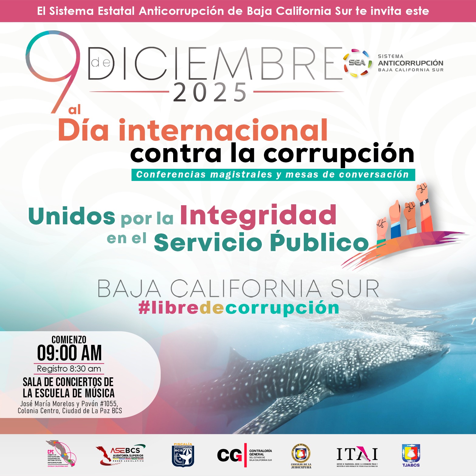 En el marco del Día Internacional contra la Corrupción, este 9 de diciembre, el Comité Coordinador (CC) del Sistema Estatal Anticorrupción de Baja California Sur (SEABCS) organiza el encuentro “Unidos por la integridad en el servicio público” para conmemorar esta fecha con la participación de expertos.