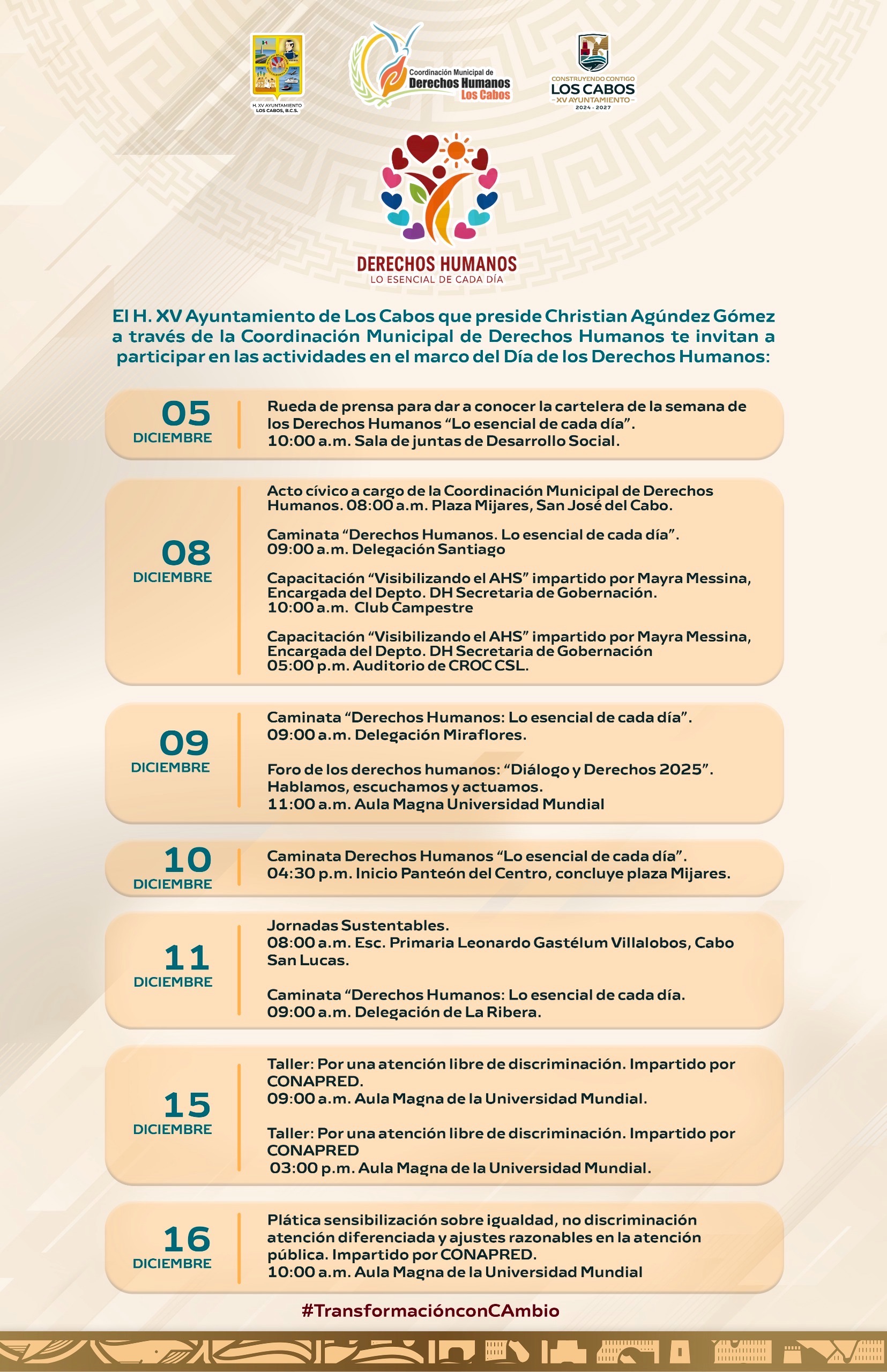 Los Cabos, Baja California Sur.- En el marco del Día de los Derechos Humanos, el XV Ayuntamiento de Los Cabos a través de la Coordinación Municipal de Derechos Humanos, dio a conocer la agenda oficial de actividades relativas a la “Semana de los Derechos Humanos: Lo esencial de cada día”, cuyo objetivo es promover la reflexión, la participación ciudadana y la construcción de una cultura de respeto y dignidad para todas las personas.