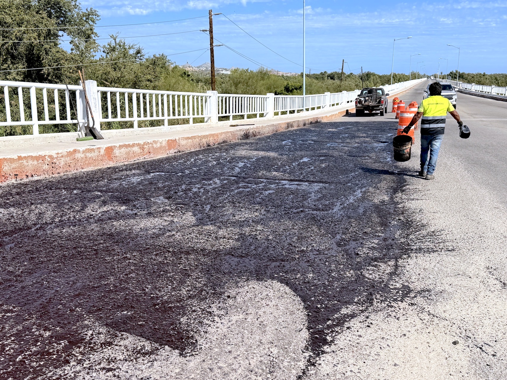 Los Cabos, Baja California Sur.– Para fortalecer la seguridad vial y mejorar las condiciones de movilidad en el municipio, el XV Ayuntamiento de Los Cabos concluyó los trabajos de bacheo en el puente Centenario, en el tramo que conduce hacia la comunidad de La Playa, como parte del programa institucional “Caza Baches”.