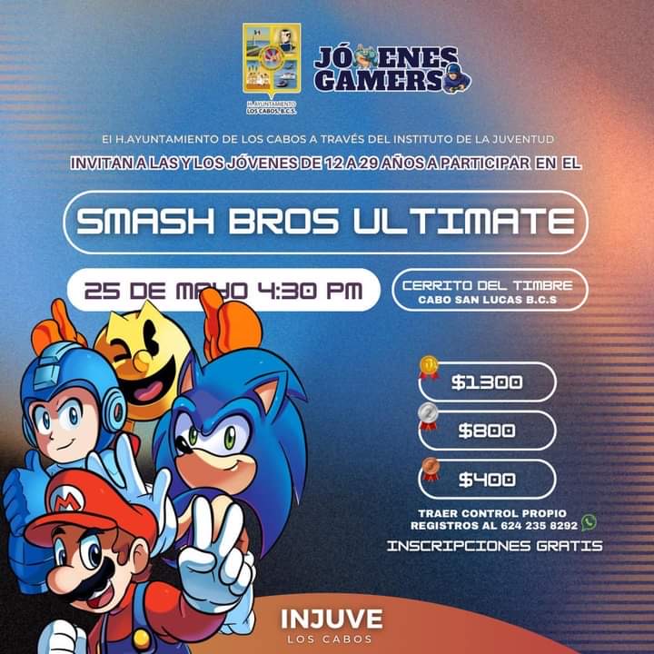 Es importante hacer hincapié, en que el Instituto también promueve actividades de sano esparcimiento como el torneo de “Smash Bros Ultimate”, mismo que se llevará a cabo éste sábado 25 de mayo a partir de las 04:30 de la tarde en el Cerrito del Timbre, ubicado en Cabo San Lucas; la entrada es libre y las inscripciones son gratuitas, mientras que el requisito es llevar control propio; las personas interesadas deberán registrarse al número de teléfono (624)235-8292.
