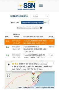 Los Cabos, B.C.S., 03 septiembre 2024.- El equipo de la Dirección Municipal de Protección Civil, bajo la encomienda de Leticia Rivera, informa a la ciudadanía que en la madrugada de este martes se registró un sismo de 4.5 grados. El evento sísmico ocurrió a las 4:58 de la mañana (hora local) y tuvo su epicentro a 4 kilómetros al suroeste de San José del Cabo, con una profundidad de 5 kilómetros, según el Servicio Sismológico Nacional (SMN).Hasta el momento, no se han reportado afectaciones mayores; sin embargo, para garantizar la seguridad de la población, las autoridades de Protección Civil iniciaron de inmediato recorridos de inspección.