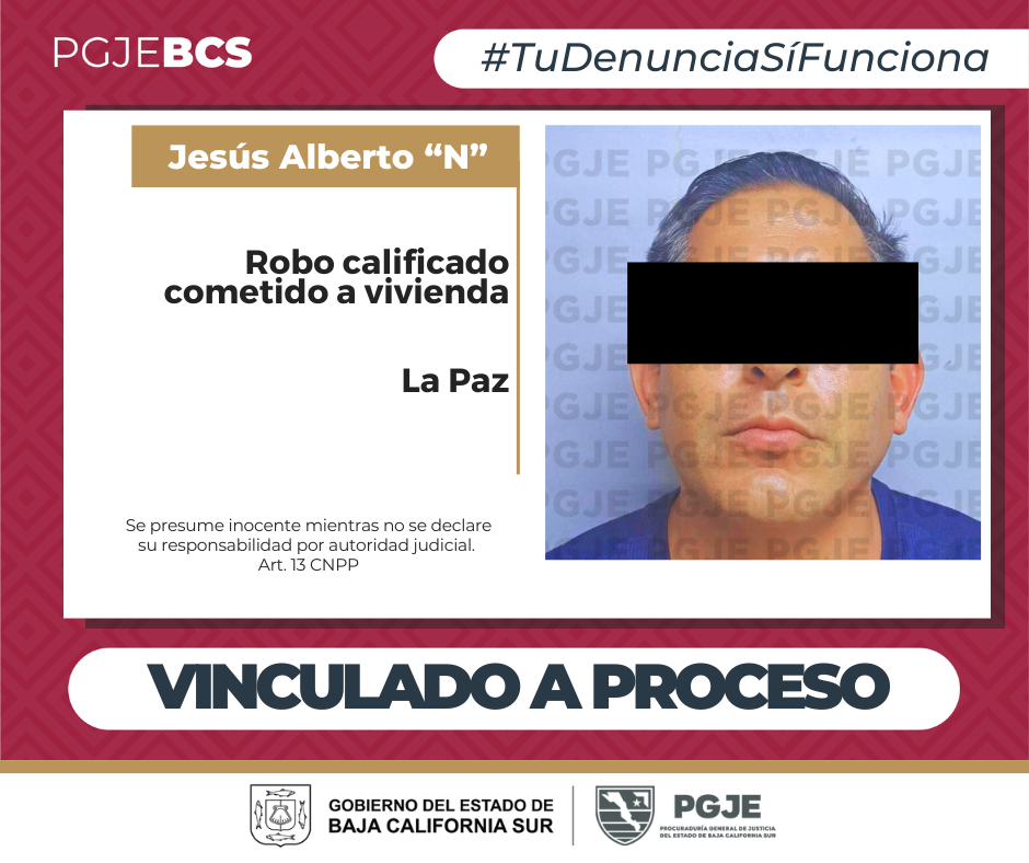 La Procuraduría General de Justicia del Estado (PGJE) logró que un Juez de Control dictara auto de vinculación a proceso y prisión preventiva en contra de Jesús Alberto “N” relacionado con la comisión del delito de robo calificado cometido a vivienda.
