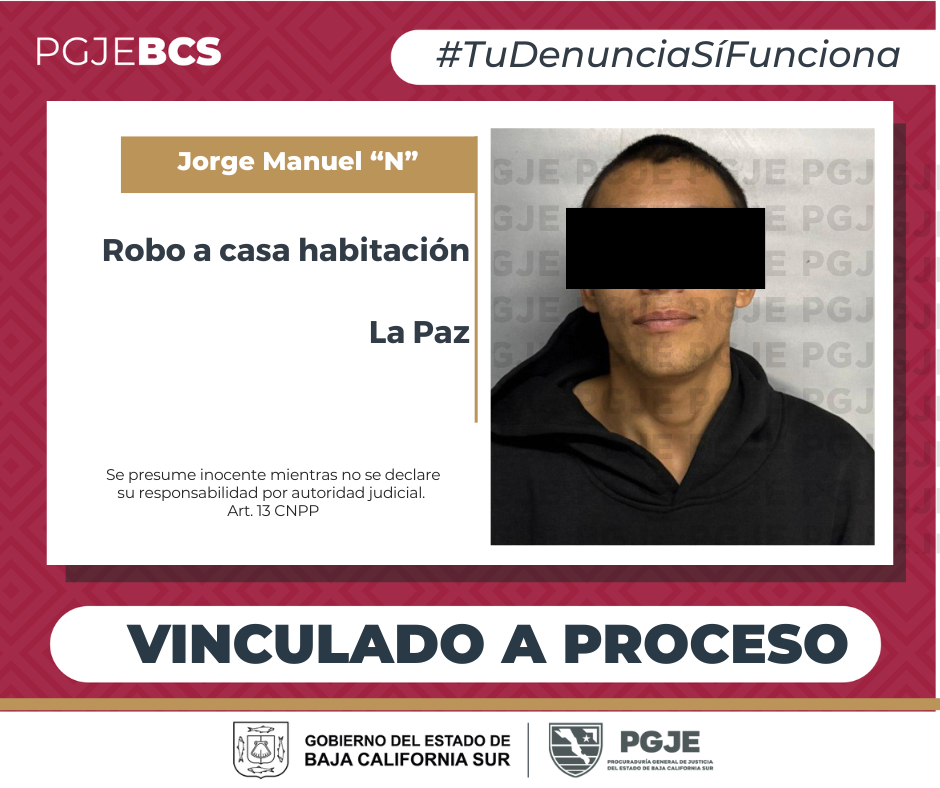 La Procuraduría General de Justicia del Estado (PGJE), obtuvo de un Juez de Control el auto de vinculación a proceso y prisión preventiva en contra de Jorge Manuel “N” relacionado con la comisión del delito de robo calificado cometido en lugar habitado.
