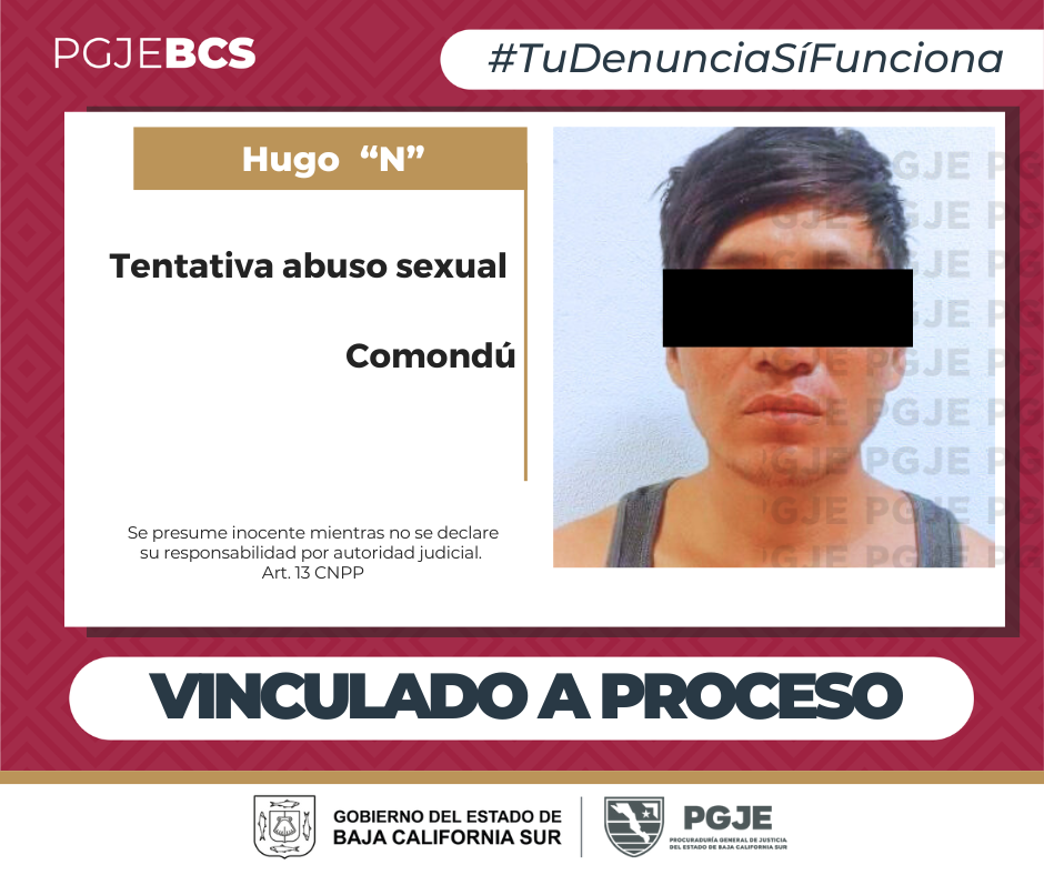 Por estos hechos y luego de la denuncia, la Procuraduría General de Justicia del Estado (PGJE), de Baja California Sur, inició las acciones ministeriales necesarias y, en la continuación de audiencia inicial para vinculación a proceso efectuada el martes 21 de octubre del año en curso, en el Centro de Justicia Penal de Ciudad Constitución, el agente del Ministerio Público de la Unidad de Investigación y Judicializa de Delitos Diversos, obtuvo del juez de Control la vinculación a proceso de Cristian Emmanuel “N” de apodo el “Chicha”, quien se encuentra en prisión preventiva por causa diversa.