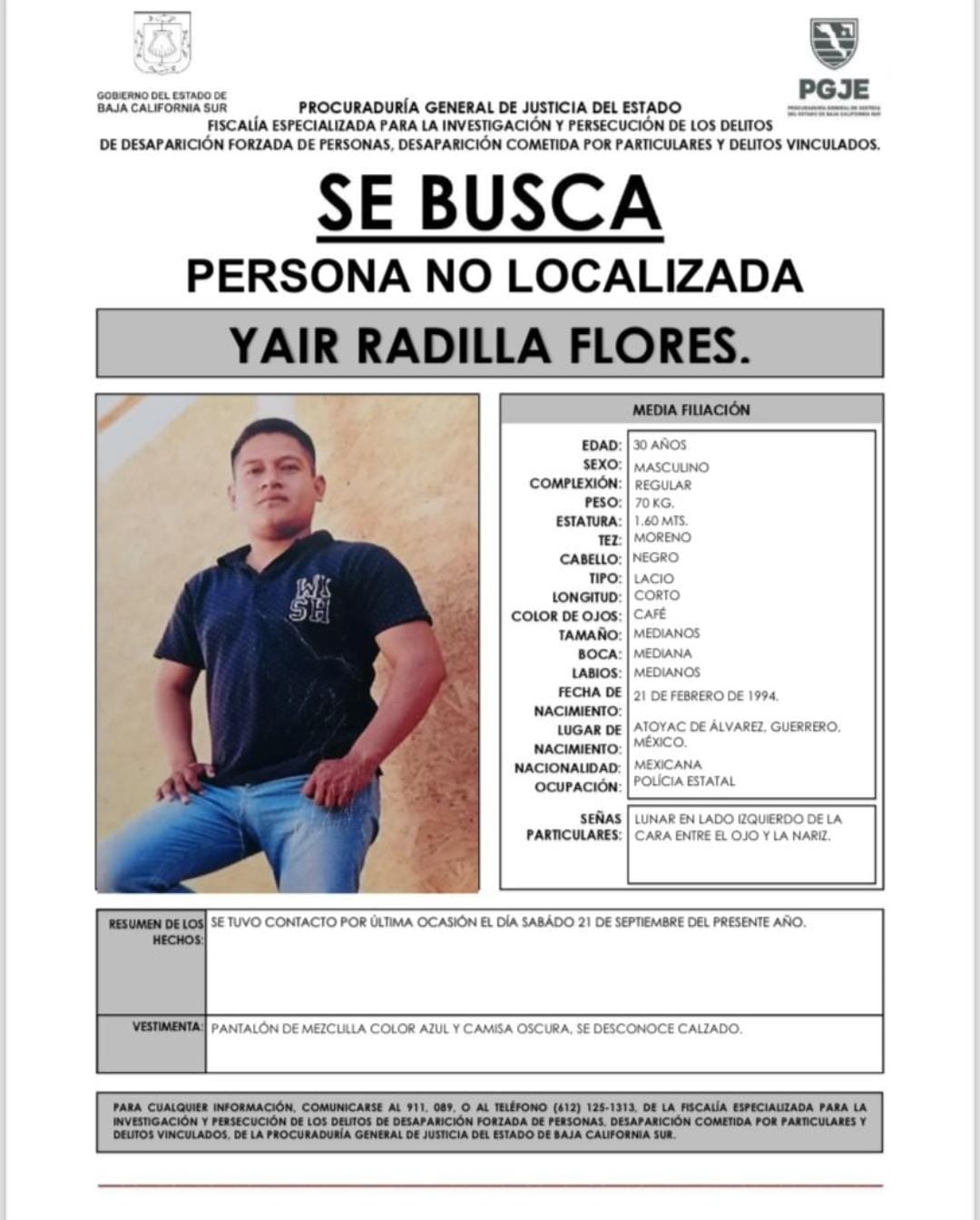 Los agentes pertenecientes a la Unidad de Reacción de esta corporación policial, han sido identificados como José Gabriel Morales Meza y Yair Radilla Flores, quienesse encontraban comisionados en Ciudad Constitución, municipio de Comondú. Al momento de su desaparición se encontraban en franquicia.