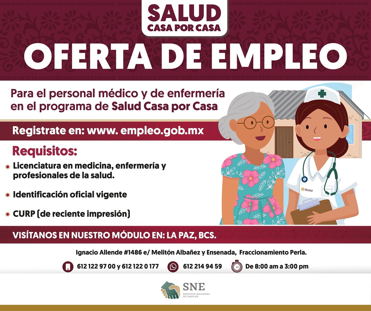 La Secretaría del Trabajo, Bienestar y Desarrollo Social (STByDS) a través del Servicio Nacional de Empleo de Baja California Sur (SNE-BCS) convoca a personal médico y de enfermería a participar en el programa “Salud Casa por Casa” que anunció recientemente la presidenta de México, Claudia Sheinbaum Pardo, para brindar atención médica a derechohabientes de Pensiones para el Bienestar de las Personas Adultas Mayores y con Discapacidad.