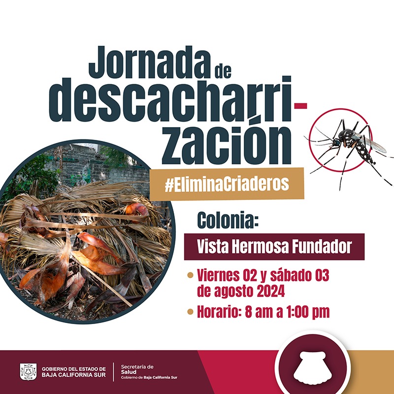 A través de la Jurisdicción Sanitaria 04 Los Cabos, el Gobierno de Baja California Sur desarrollará este viernes y sábado jornada de descacharrización en la colonia Vista Hermosa Fundador, como parte de las acciones emprendidas por la autoridad sanitaria para fortalecer la prevención del dengue, enfermedad febril que es transmitida por la picadura del mosco Aedes aegypti.