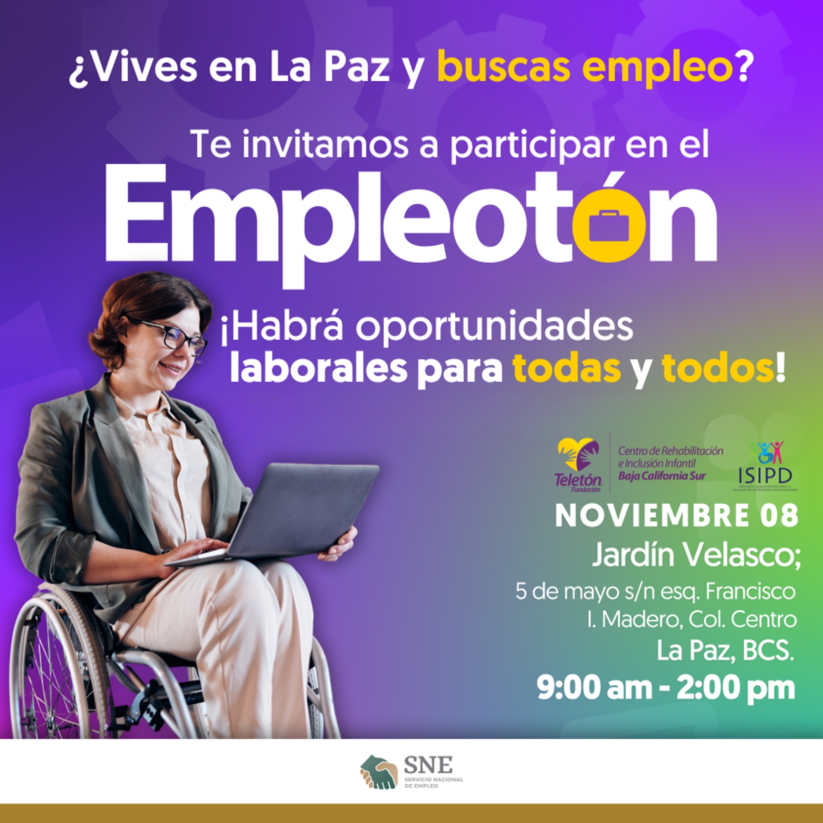 El Servicio Nacional de Empleo de Baja California Sur (SNE-BCS) y Fundación Teletón, realizarán “Empleotón 2024”, a desarrollarse el viernes ocho de noviembre de 9:00 a 14:00 horas, en el Jardín Velasco, en La Paz, en la que ofertarán vacantes de empleos de diferentes sectores.