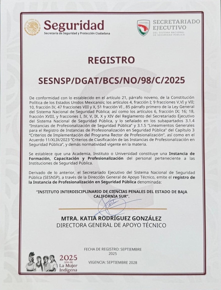 La Procuraduría General de Justicia del Estado (PGJE) de Baja California Sur, informa que el martes 7 del mes en curso, el Instituto Interdisciplinario de Ciencias Penales (IICP), recibió el registro de Instancia de Profesionalización de Seguridad Pública, del Secretariado Ejecutivo del Sistema Nacional de Seguridad Pública (SESNSP).
