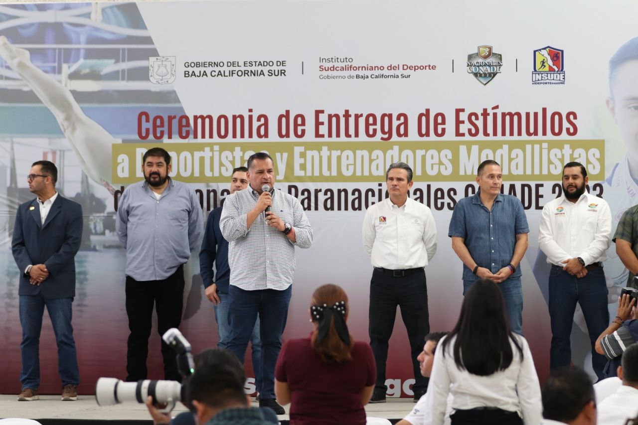 Con la representación del gobernador Víctor Manuel Castro Cosío, el secretario General de Gobierno, José Saúl González Núñez, acompañado del director general del Instituto Sudcaliforniano del Deporte (INSUDE), Noé Fiol Verduzco, encabezó la ceremonia de entrega de estímulos a 118 deportistas medallistas de los Nacionales y Paranacionales CONADE 2023 y a 54 entrenadores, que posicionaron a Baja California Sur, en la máxima justa nacional deportiva.