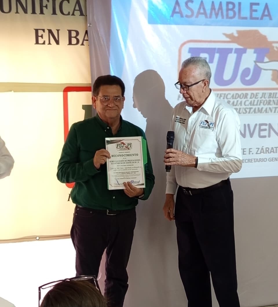 La Paz, Baja California Sur, a 13 de abril de 2026.- El Instituto de Seguridad y Servicios Sociales de los Trabajadores del Estado (ISSSTE), a cargo del director general, Martí Batres Guadarrama, a través de la Subdelegación de Prestaciones en Baja California Sur, fue reconocido por el Frente Unificador de Jubilados y Pensionados (FUJUPI), en el marco de la asamblea de dicha organización por la calidad en la atención que se brinda a jubilados y pensionados en los diversos servicios que ofrece esta área sustantiva.