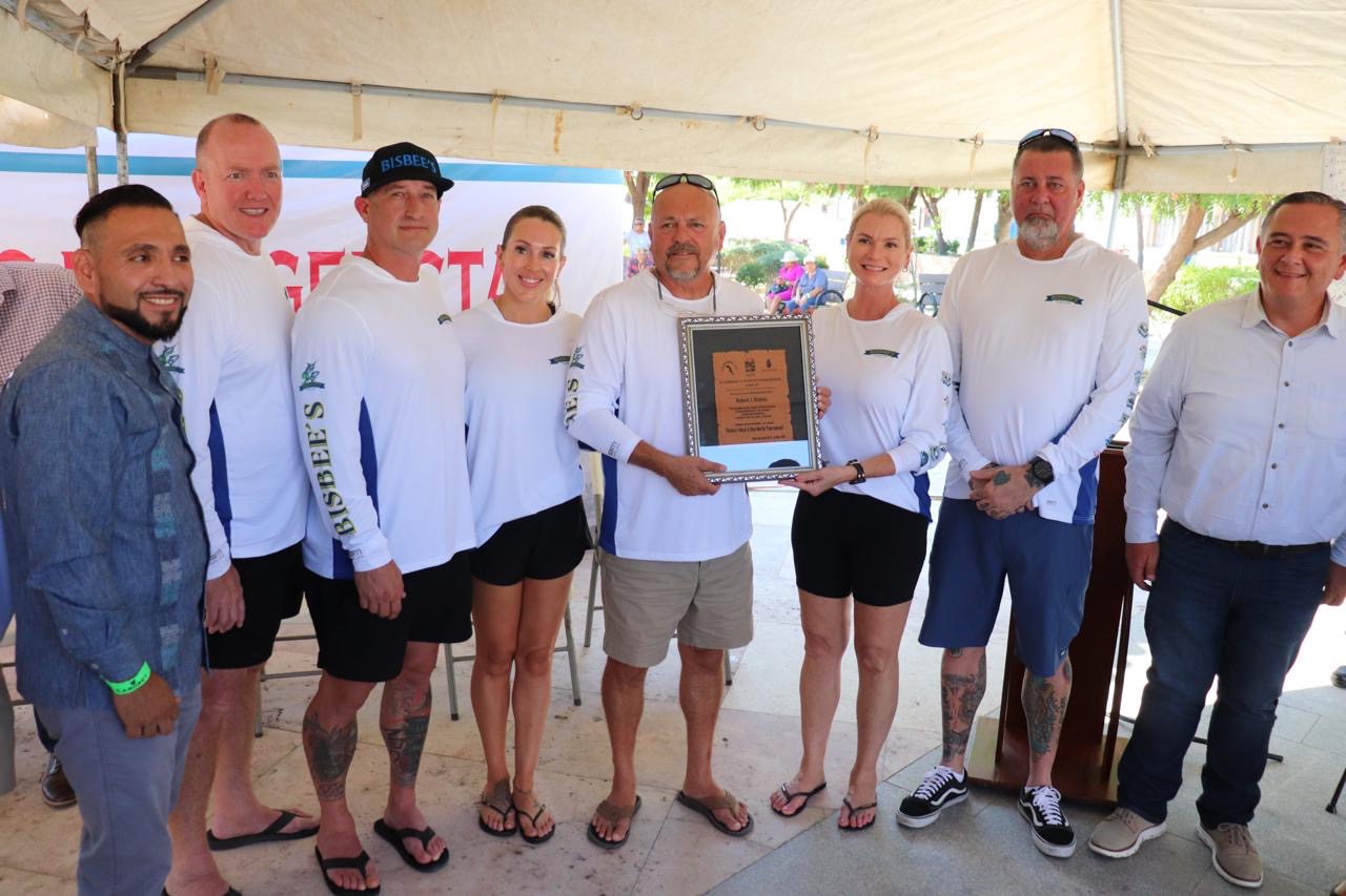 En el evento realizado en la plaza pública Amelia Wilkes Ceseña, el secretario general delegacional José Samuel Cisneros Peruyero, en representación del presidente municipal Christian Agúndez Gómez, así como el director general de Desarrollo Social Carlos Castro Ceseña y el promotor de pesca deportiva en Baja California Sur Clicerio Mercado, hicieron entrega de un reconocimiento a la familia de Robert Joseph Bisbee por ser pionero de la pesca deportiva como parte de un legado al desarrollo económico y social de Cabo San Lucas.