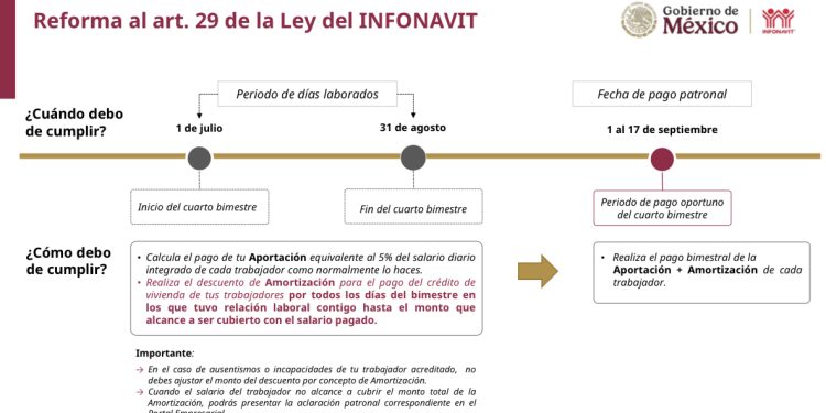 Los empleadores deberán realizar los ajustes a sus sistemas y procesos para de-terminar, realizar y enterar en términos de la legislación aplicable, los descuentos a los salarios de sus trabajadores que se destinen al pago de abonos para cubrir préstamos otorgados por el Instituto. La aplicación de esta disposición es a partir del pago de salarios correspondientes al 4° bimestre de 2025; esto es, los corres-pondientes a los meses de julio y agosto, que deberá realizarse a más tardar el 17 de septiembre de 2025.
