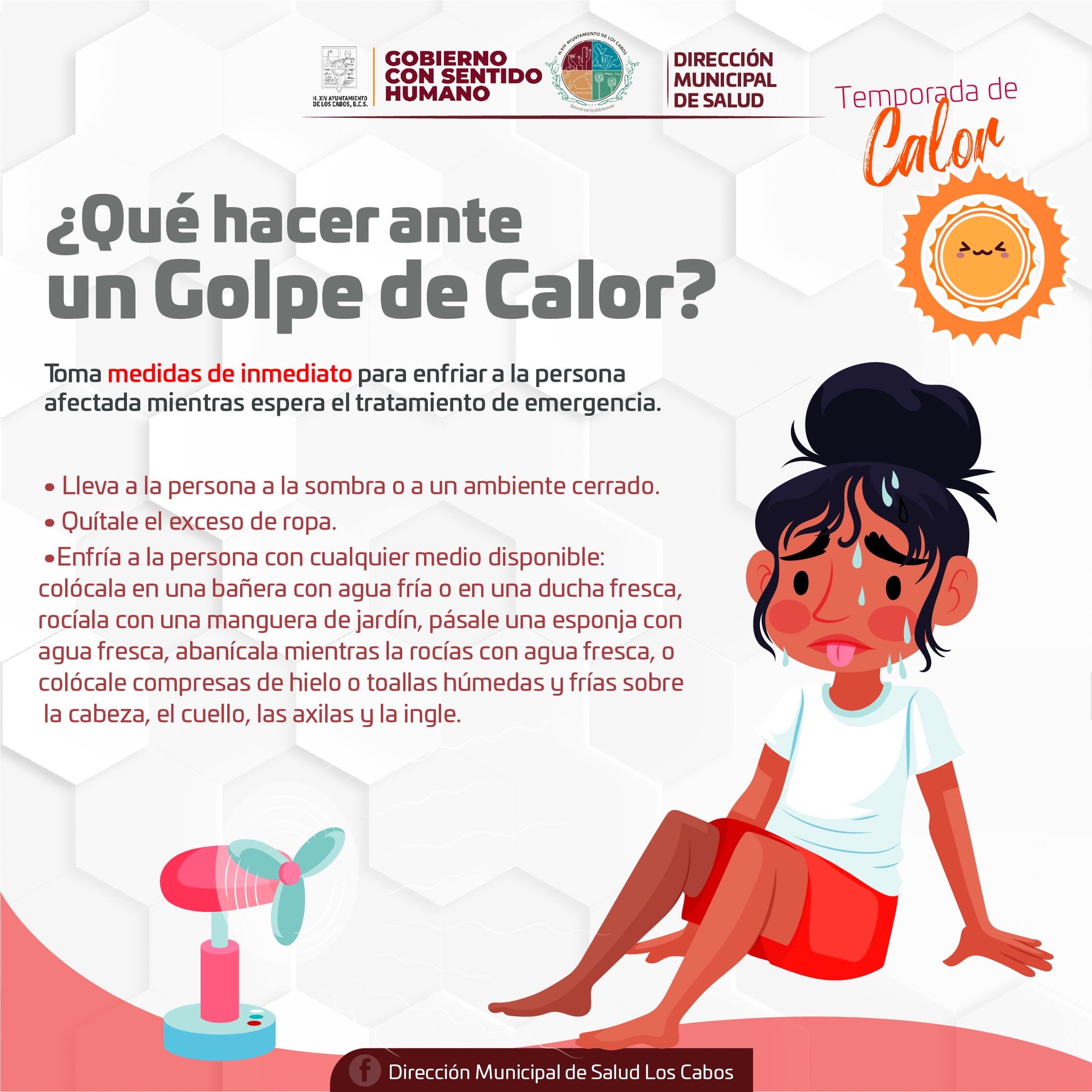 Los Cabos, B.C.S., 15 de julio de 2024.- La Dirección Municipal de Salud, a cargo del Dr. Juan Carlos Costich Pérez, reitera las recomendaciones a la población para evitar los golpes de calor durante esta temporada, es importante mantenerse hidratado, evitar la exposición prolongada al sol (especialmente durante las horas pico de calor), usar ropa suelta de colores claros que permita la ventilación, tomar descansos regulares en lugares frescos y usar protector solar.