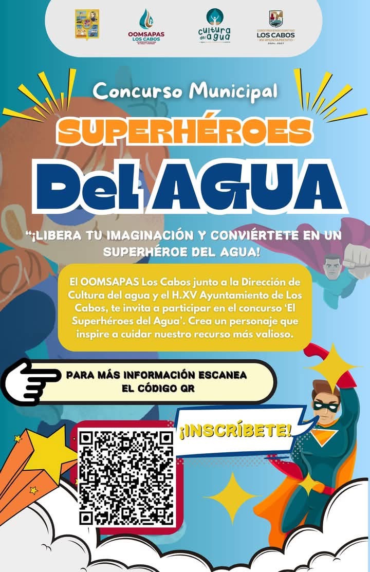Los Cabos, B.C.S. – OOMSAPAS Los Cabos, en colaboración con la Dirección de Cultura del Agua y el H. XV Ayuntamiento de Los Cabos, convoca a todos los niños y adolescentes del municipio a participar en el concurso “Superhéroes del Agua”. Este certamen tiene como objetivo fomentar la creatividad y, al mismo tiempo, sensibilizar a las nuevas generaciones sobre la importancia del cuidado y preservación del agua, un recurso fundamental para el desarrollo de nuestra comunidad.