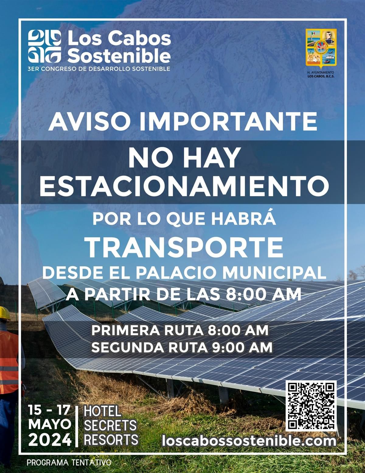 Dicho congreso que reunirá a personas líderes de opinión, personas empresarias, académicas e integrantes de la comunidad, se llevará a cabo en las instalaciones del hotel Secrets en San José del Cabo a las 9:00 de la mañana; en ese sentido se informa que se contará con transporte público que saldrá a las 8:00 de la mañana desde el Palacio Municipal en la zona Centro de San José del Cabo.