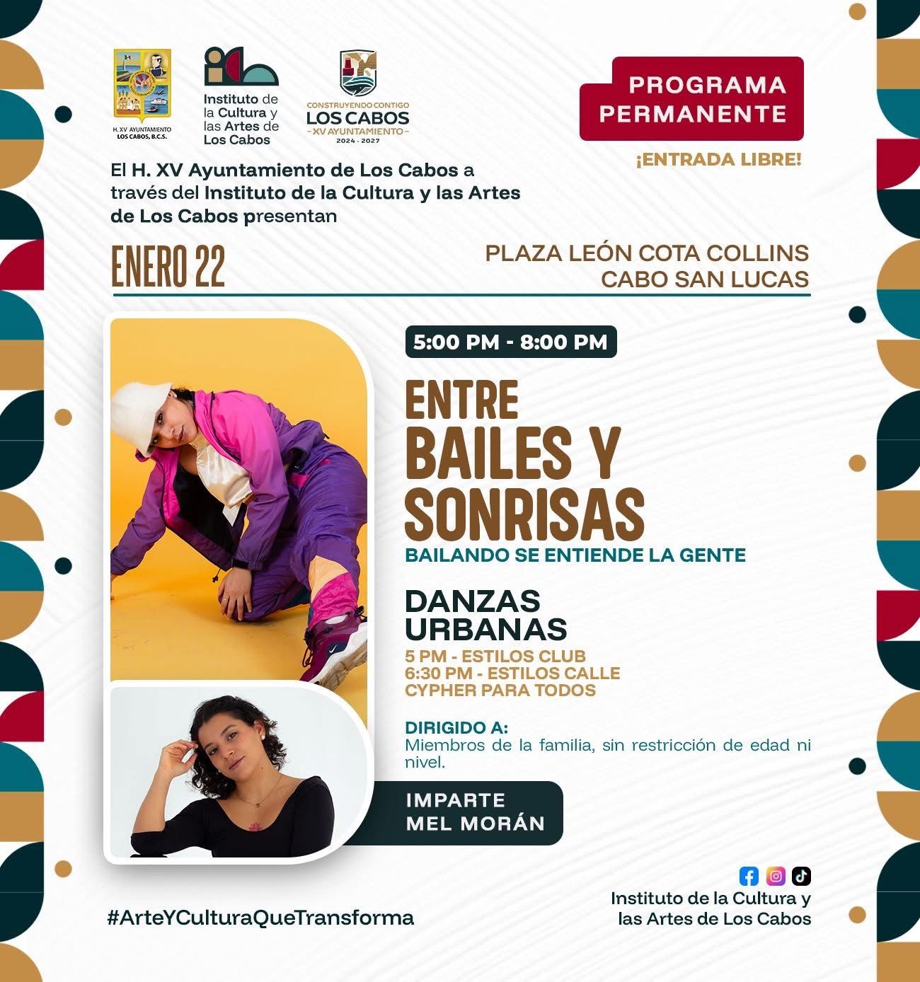 Los Cabos, Baja California Sur. – El próximo miércoles 22 de enero el H. XV Ayuntamiento de Los Cabos a través del Instituto de la Cultura y las Artes (ICA), iniciará programa “Entre Bailes y Sonrisas: Bailando se Entiende la Gente “, dirigido al público en general con clases de baile gratuitas de danza urbana, de 05:00 de la tarde a 08:00 de la noche, en la plaza pública León Cota Collins en Cabo San Lucas.