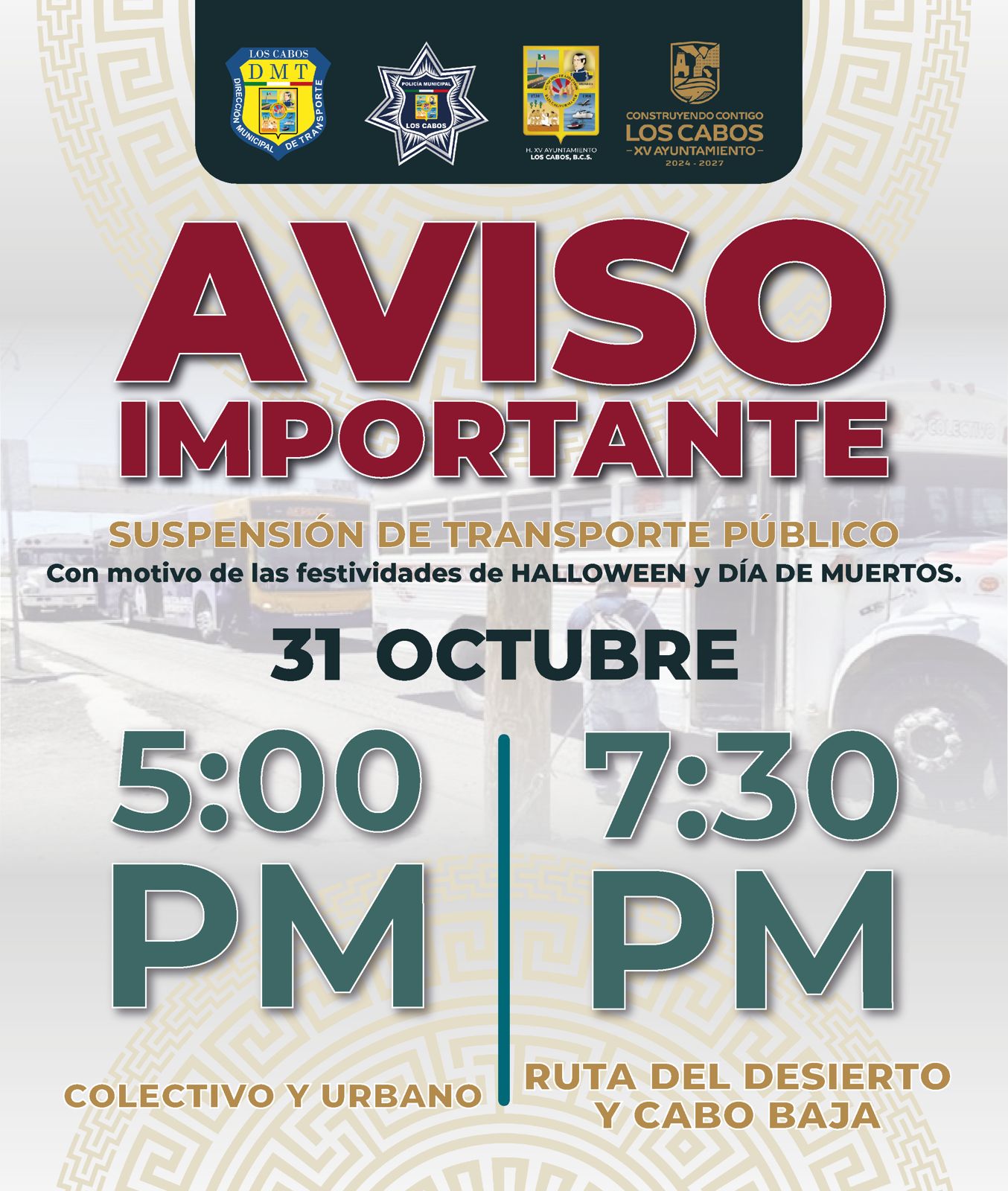 Para finalizar, se destaca que el servicio de transporte público Urbano y Colectivo dejara de operar a partir de las 5:00 de la tarde el 31 de octubre, por protocolos de seguridad. Asimismo, se suspenderá el servicio de transporte federal Ruta del desierto y Cabo Baja, a partir de las 7:30 de la noche.